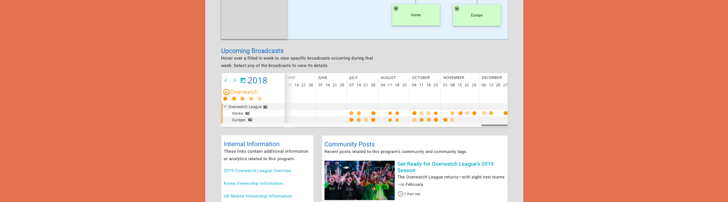 The Esports department needed our team to assist with more of a product design approach to solving problems they were experiencing in regard to planning and communicating out the ever increasingly complex calendar of content. Esports and other departments depend on this product to store groups of broadcasts to feed into the Blizzard Esports App. These buckets of broadcasts (programs) are a point of interest for leadership within Esports, but there wasn’t a central location for them to view program information.